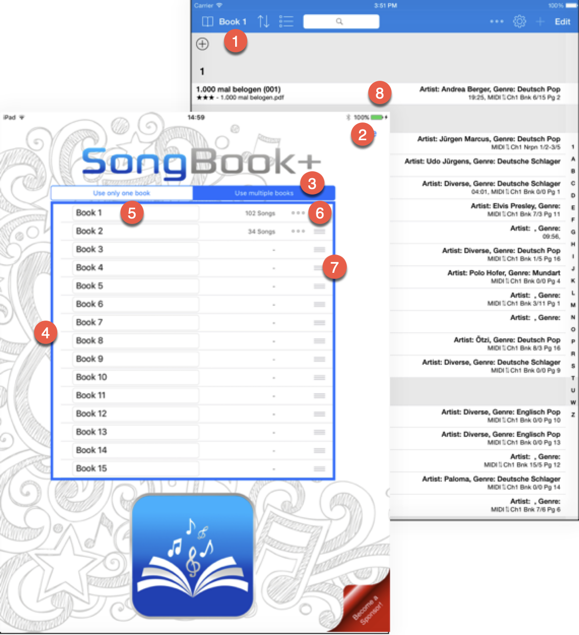 Databáze, adresář se soubory a seznam zadaných umělců a žánrů jsou sdíleny všemi knihami.