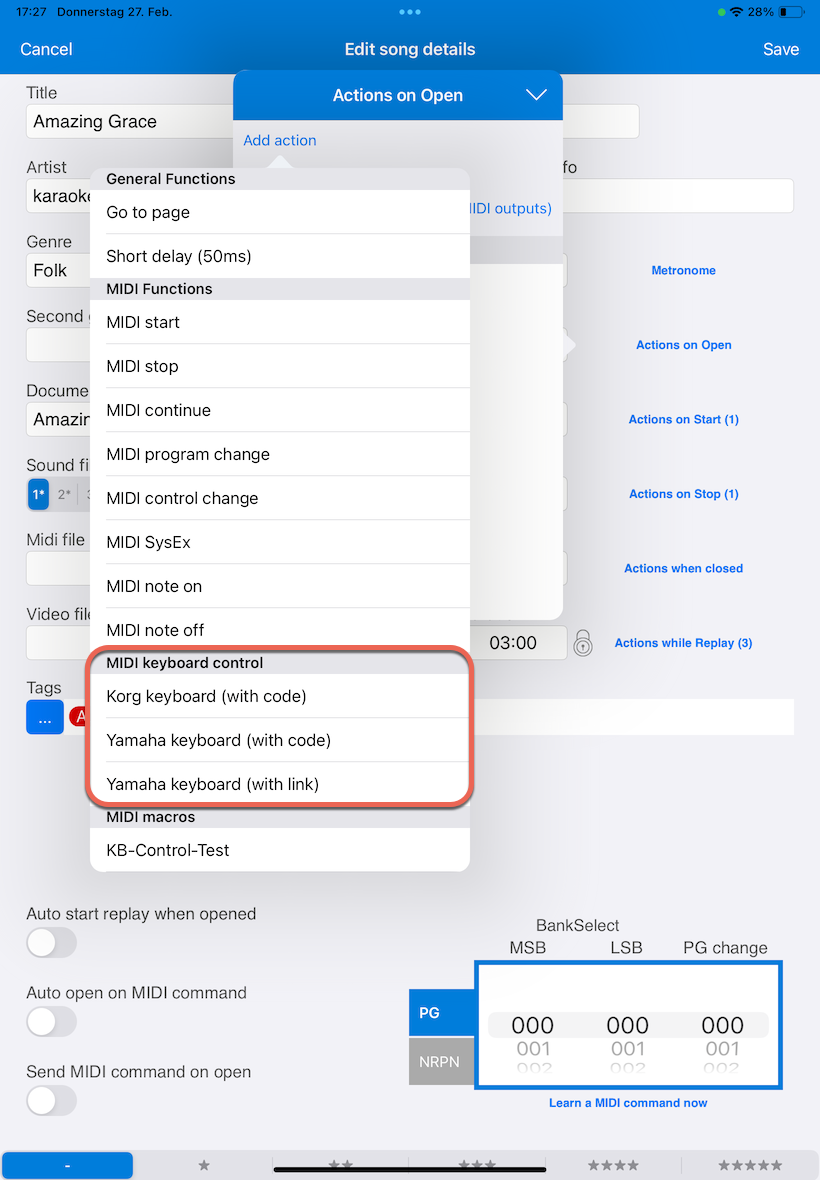 V případě potřeby je tak možné přes *Akcích při otevření* ovládat i více různých klávesnic s *jednoduchým ovládáním klávesnice* (se stejným kódem a/nebo stejným odkazem), například Yamaha Tyros, Yamaha Genos a Korg PA Keyboard současně.