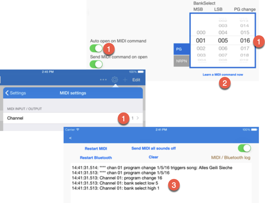 Použijte prosím vestavěný MIDI monitor SongBook+, abyste viděli, co je skutečně přijímáno na MIDI rozhraní, pokud otevření písní nefunguje podle očekávání.