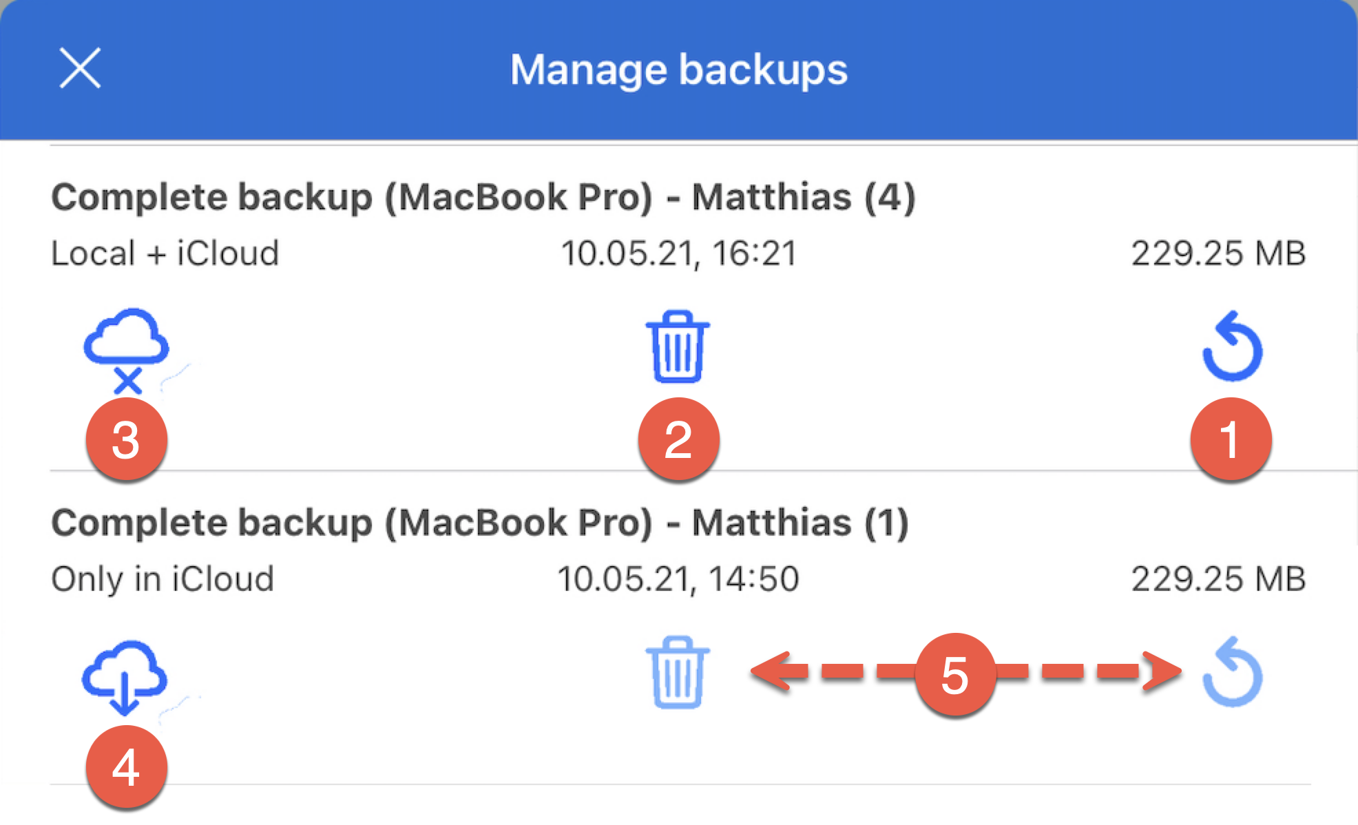 Tlačítka pro obnovení nebo nezvratné smazání jsou aktivní pouze tehdy, když je záloha stažená (4).