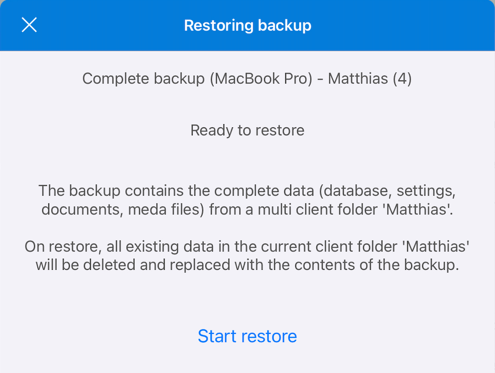 Pokud takový soubor kliknete v aplikaci Soubory nebo předáte z jiné aplikace pomocí „Otevřít v...“ do SongBook+, SongBook+ se spustí a zobrazí okno pro obnovení zálohy (viz výše).