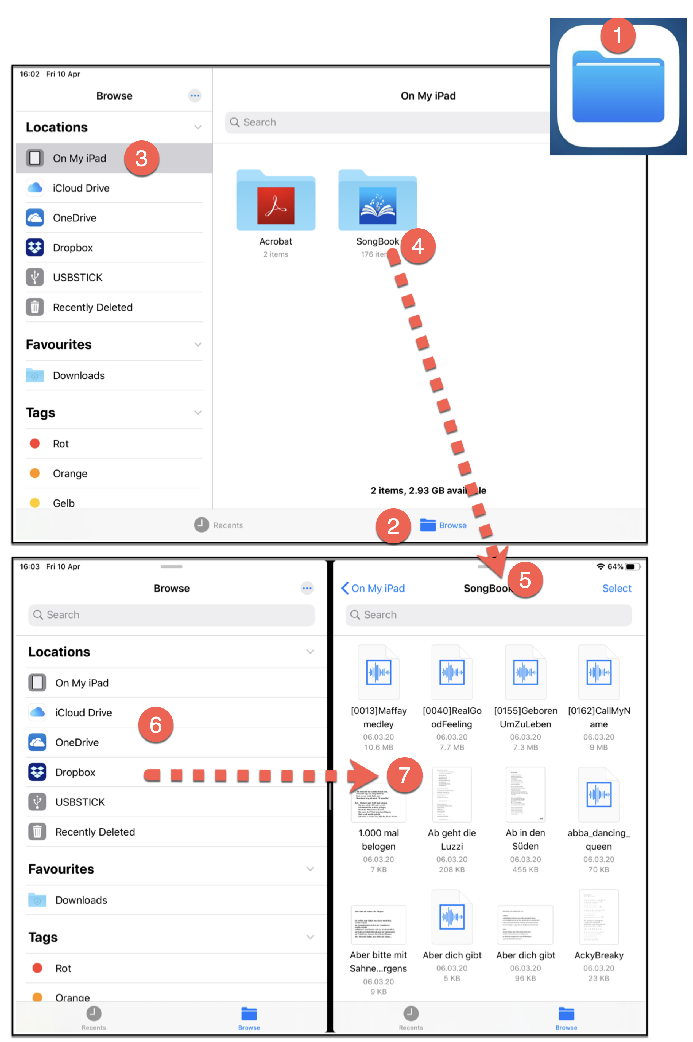 Using the "Files" app, you can copy files from a USB stick, your preferred cloud app, or even from a server into SongBook.