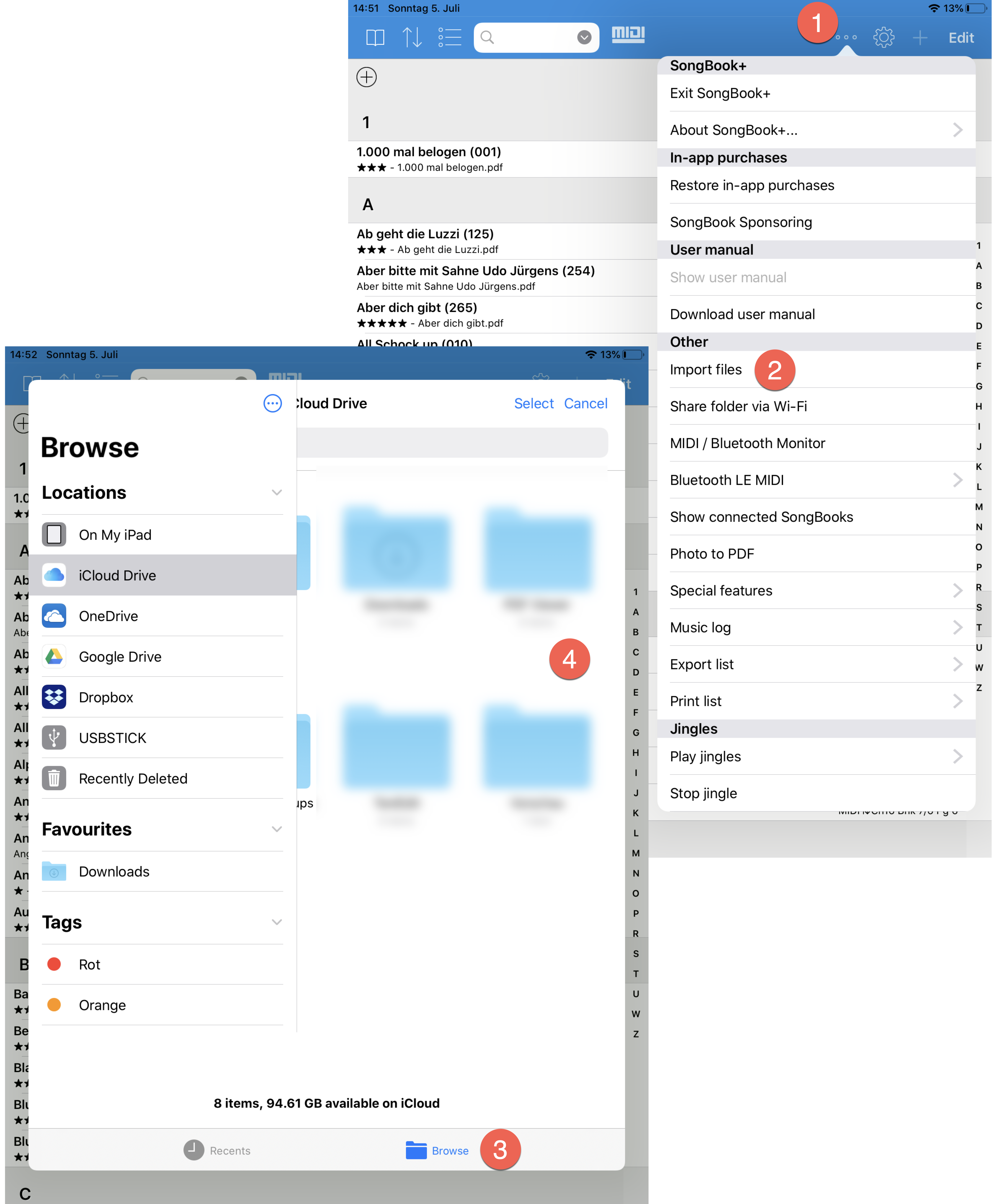 With the "Import Files" function, you can import files directly into SongBook+ from a USB stick, your preferred cloud app, or even from a server.
