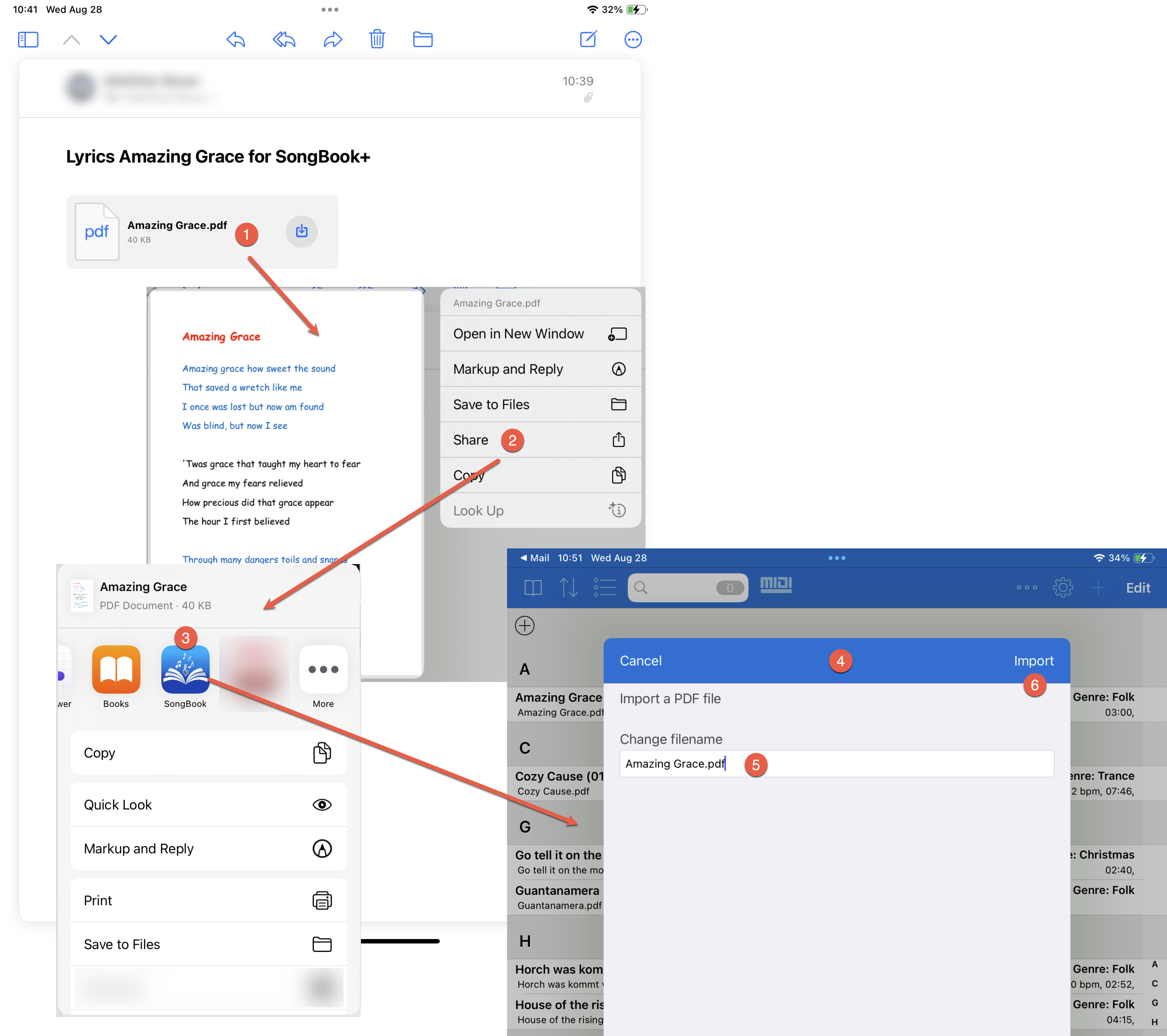 The following image shows as an example how to import a PDF from an email attachment into SongBook+: