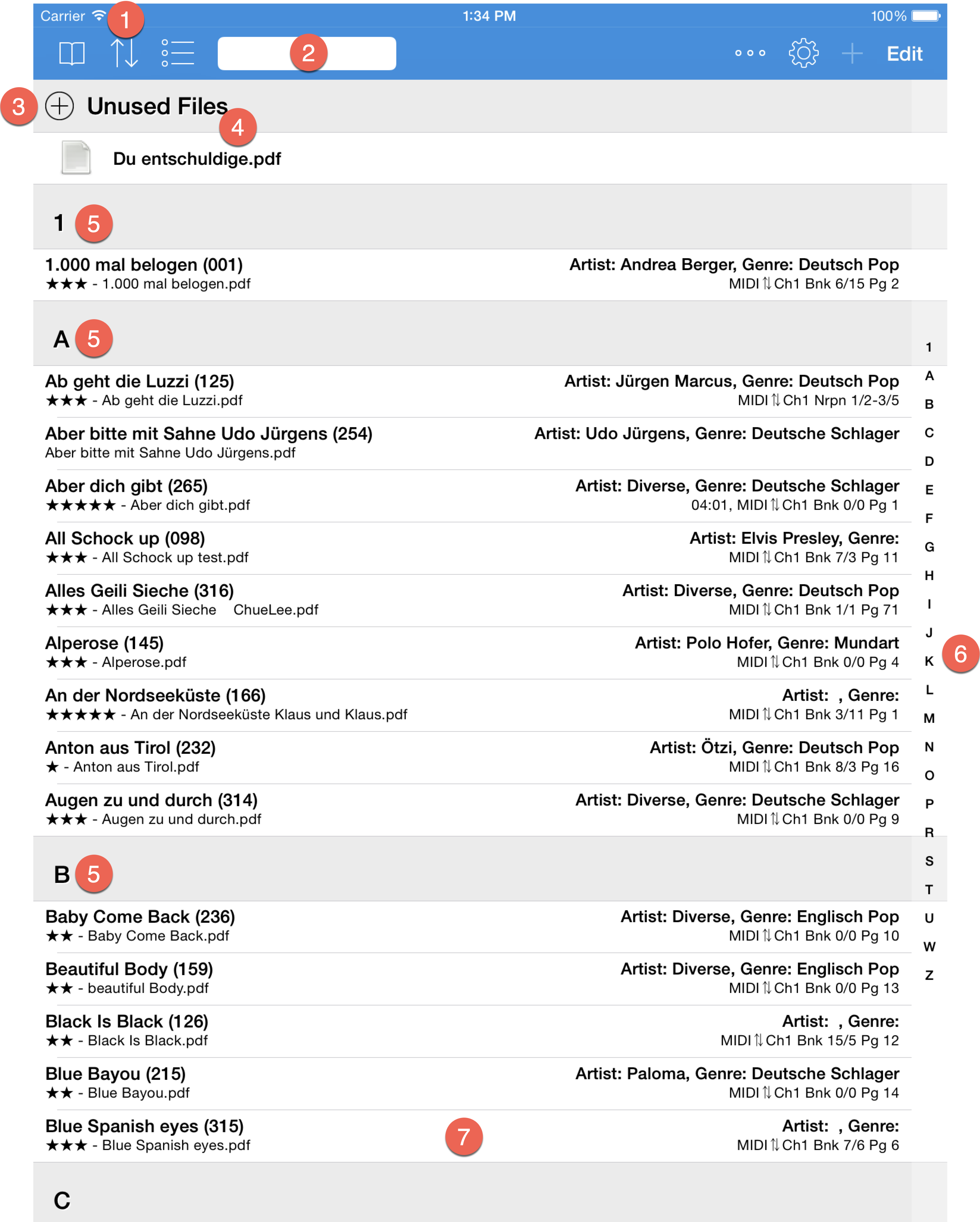 <img src="https://2961795397-files.gitbook.io/~/files/v0/b/gitbook-x-prod.appspot.com/o/spaces%2FUd6jgszxLuhJfHuCabdk%2Fuploads%2Fgit-blob-ba997d26d2b5a8591e4018309358525ae2b1c5eb%2Fbulletpoint-06.png?alt=media" alt="" data-size="line">The index on the right side allows for quick scrolling and fast alphabetical access in the song list.\
