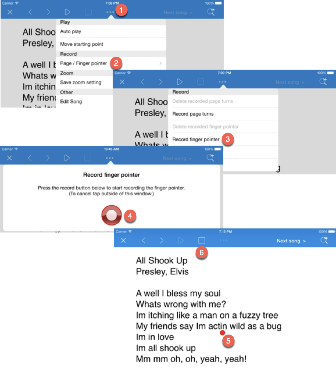 L'enregistrement position par position peut être difficile avec des chansons rapides. Souvent, il suffit de montrer uniquement la ligne actuelle avec le point.