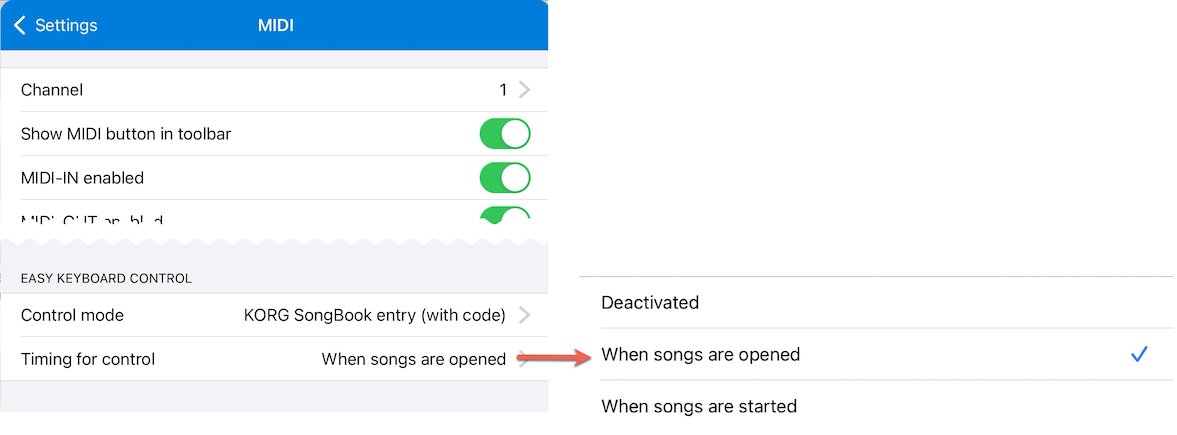Vous trouverez dans les paramètres MIDI de SongBook+ une section "Commande simple du clavier" avec différents types de commandes à choisir.