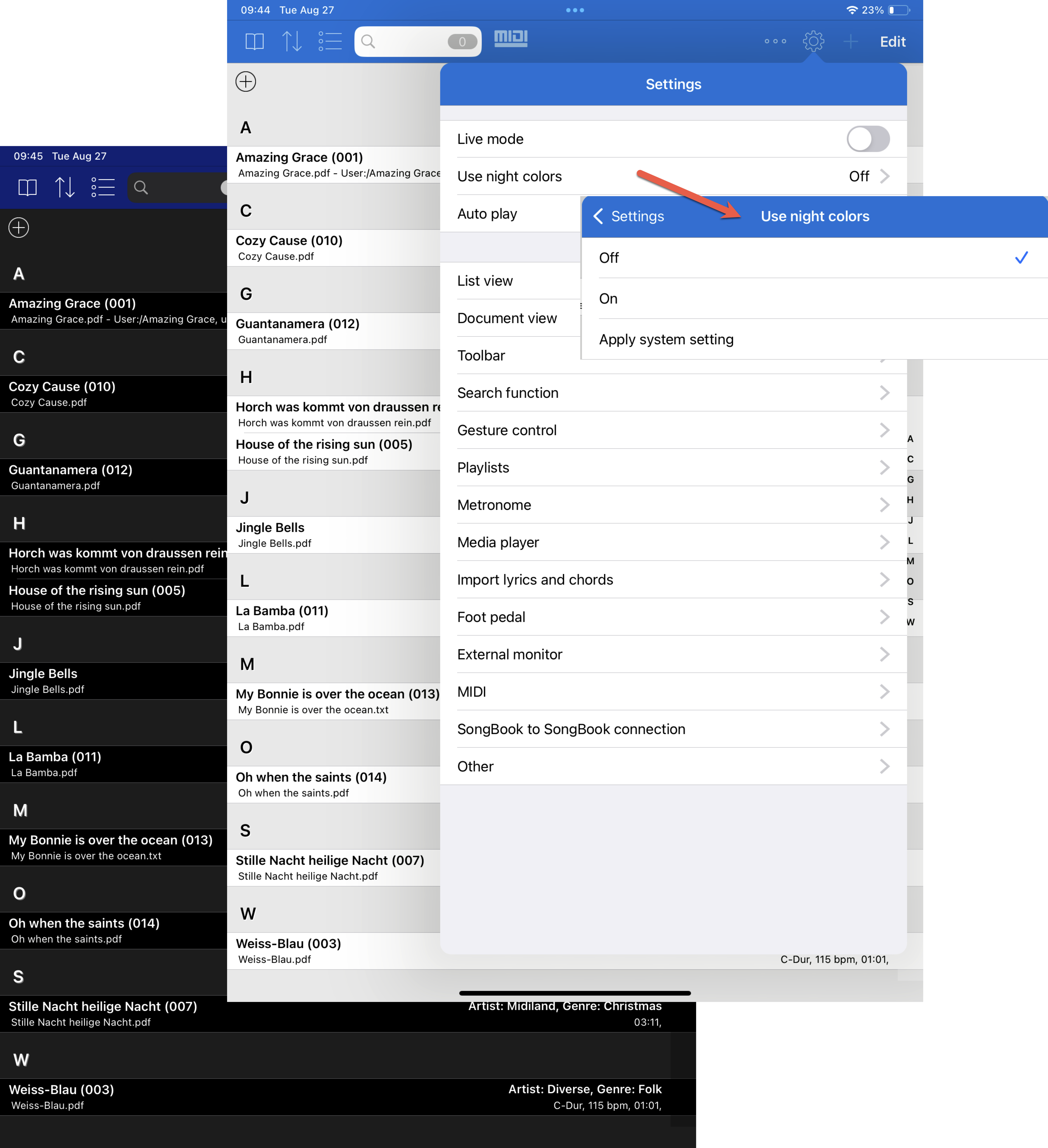 L'option « Mode Nuit » vous permet de basculer précisément entre les couleurs normales et les couleurs inversées pour une scène sombre ou de laisser l'appareil prendre en charge les paramètres correspondants.