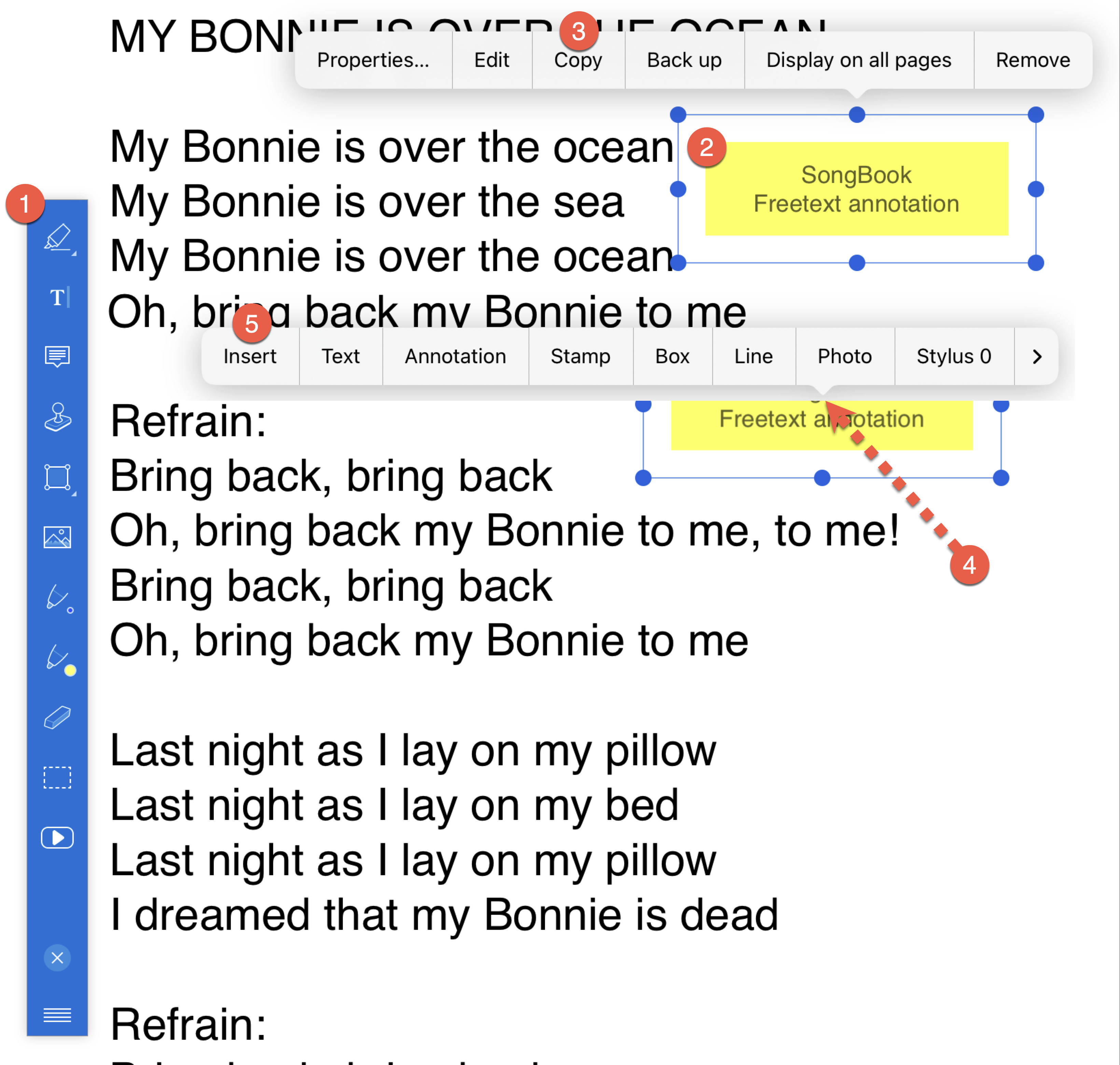 <img src="https://2946640067-files.gitbook.io/~/files/v0/b/gitbook-x-prod.appspot.com/o/spaces%2FNJT6kCLQc2TPHJm7Lqfd%2Fuploads%2Fgit-blob-10610b4b1145041bac45e0b06ad06405078a9b4e%2Fbulletpoint-04.png?alt=media" alt="" data-size="line">Appuyez un peu plus longuement à l'endroit où vous souhaitez insérer l'annotation. (Cela peut être une autre page ou une autre chanson).