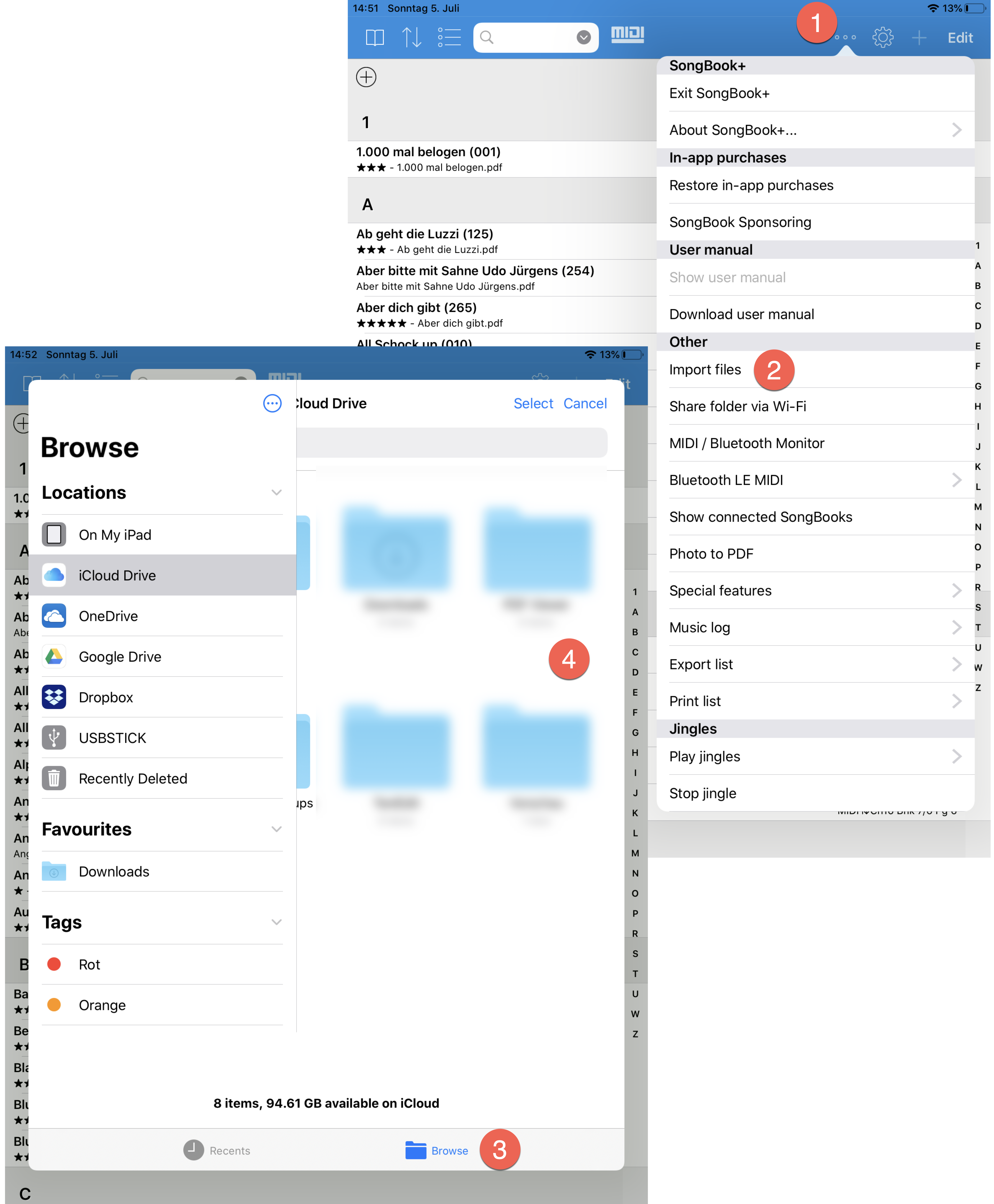 Com a função "Importar Arquivos", você pode obter arquivos de um pen drive, do seu aplicativo de nuvem preferido ou até mesmo de um servidor diretamente no SongBook+.