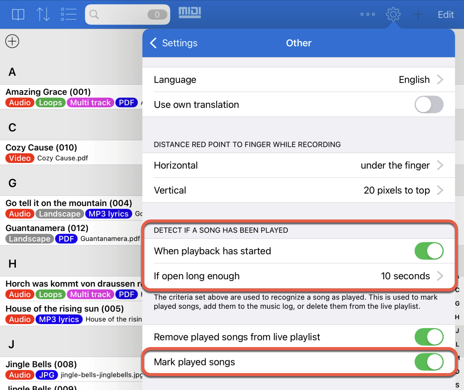 O SongBook+ pode marcar as músicas que já foram tocadas. Assim, você pode facilmente reconhecer se já tocou a música durante uma apresentação.