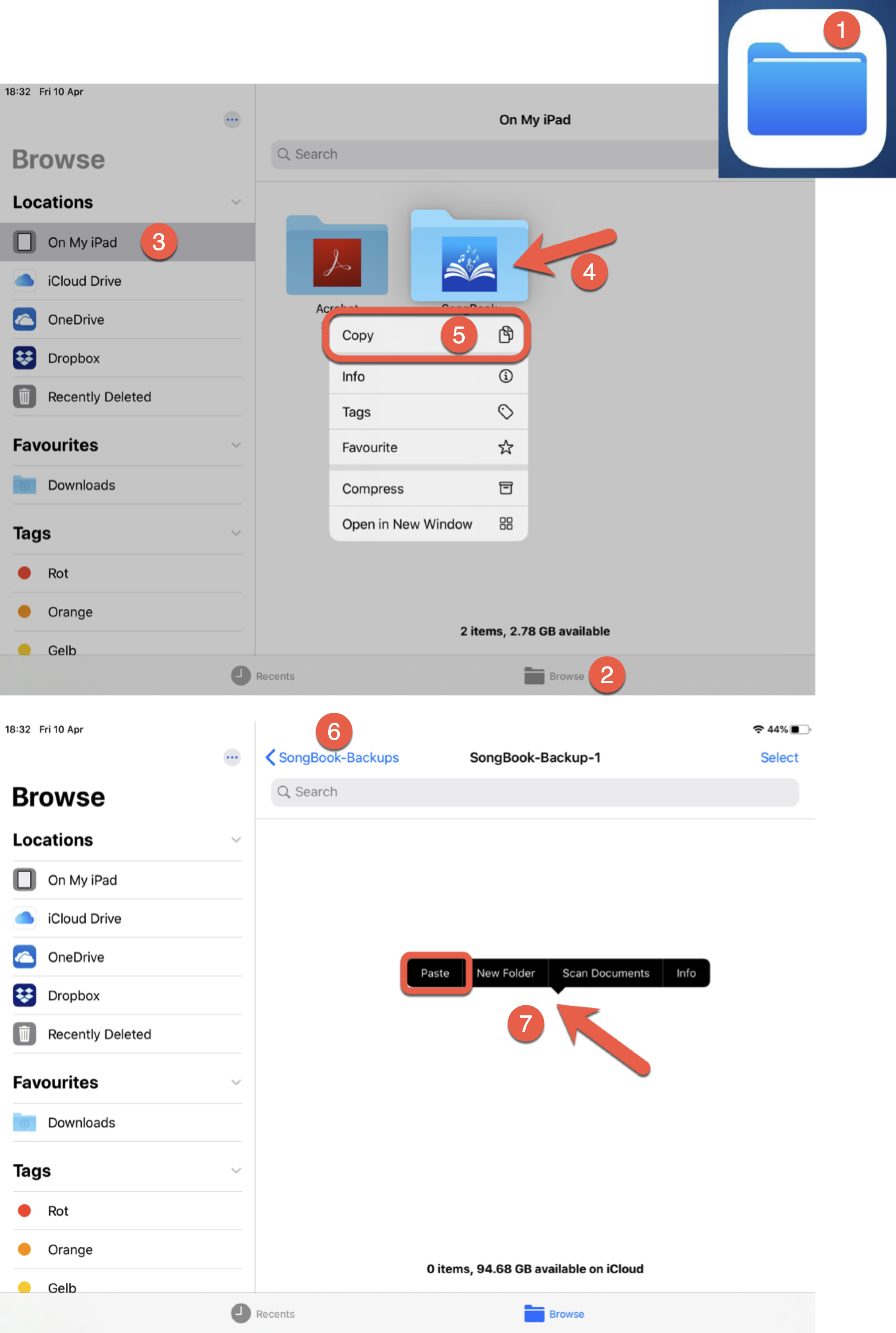 Primeiro, crie com o aplicativo Arquivos no local de destino desejado (no seu aplicativo de nuvem ou no pendrive USB) uma nova pasta, com um nome apropriado, por exemplo, *SongBook-Backup-1*, onde você deseja armazenar os arquivos copiados.