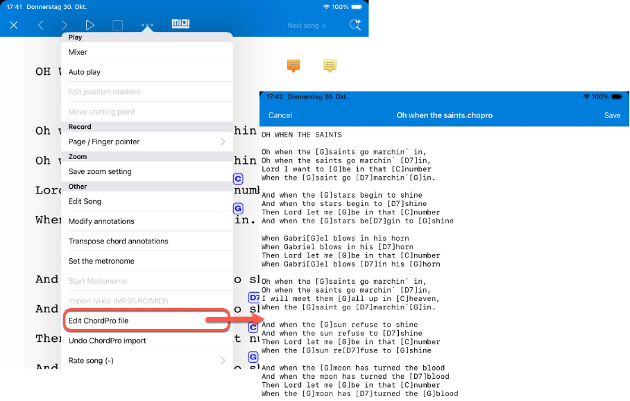 Bereits importierte ChordPro-Dateien können auch nachträglich noch editiert werden.