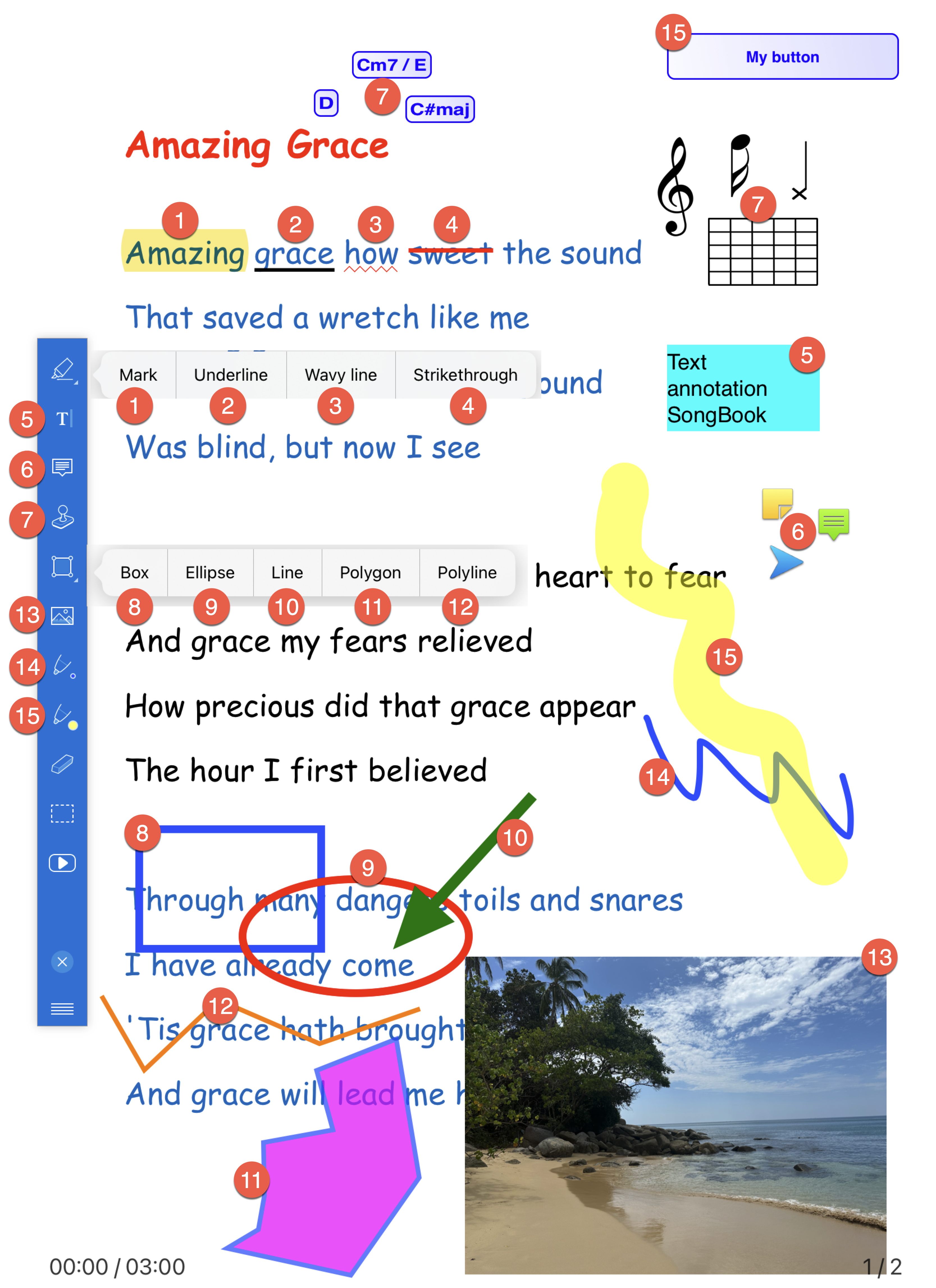 En el dibujo a mano alzada (14+15) y al dibujar formas (8-12), puede usar la función de deshacer/rehacer para revertir los últimos pasos.