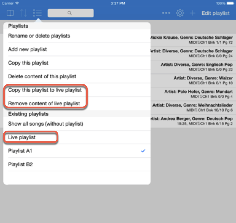 Cuando el uso de la lista de reproducción en vivo está activado en la configuración de SongBook+, siempre aparece como la primera lista de reproducción y hay puntos de menú adicionales.