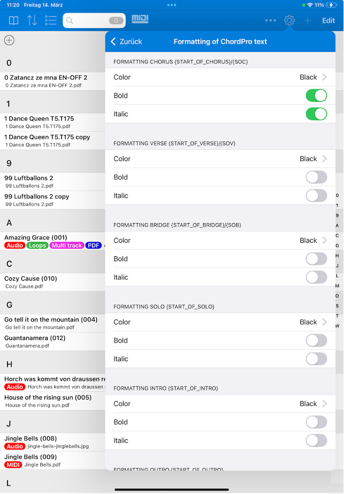 A partir de la versión 6.4, SongBook+ también puede adoptar la información de formato de los archivos ChordPro y mostrar áreas como estribillo, verso, etc., con diferentes colores o incluso en cursiva o negrita.