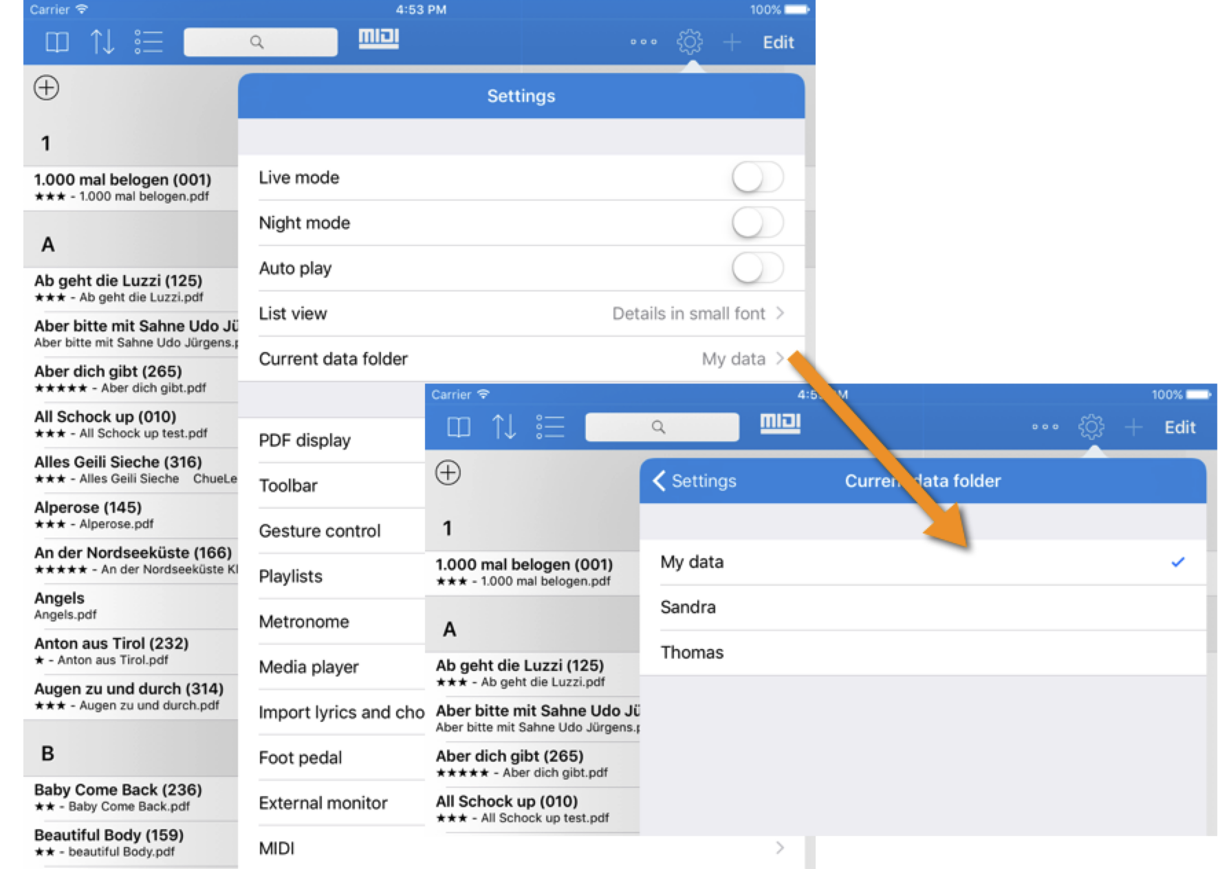 如果您想将其他音乐家的数据复制到您的 SongBook+ 中，而不覆盖自己的数据，您现在可以在 SongBook+ 中新建子目录，并在其中创建完全独立的数据。