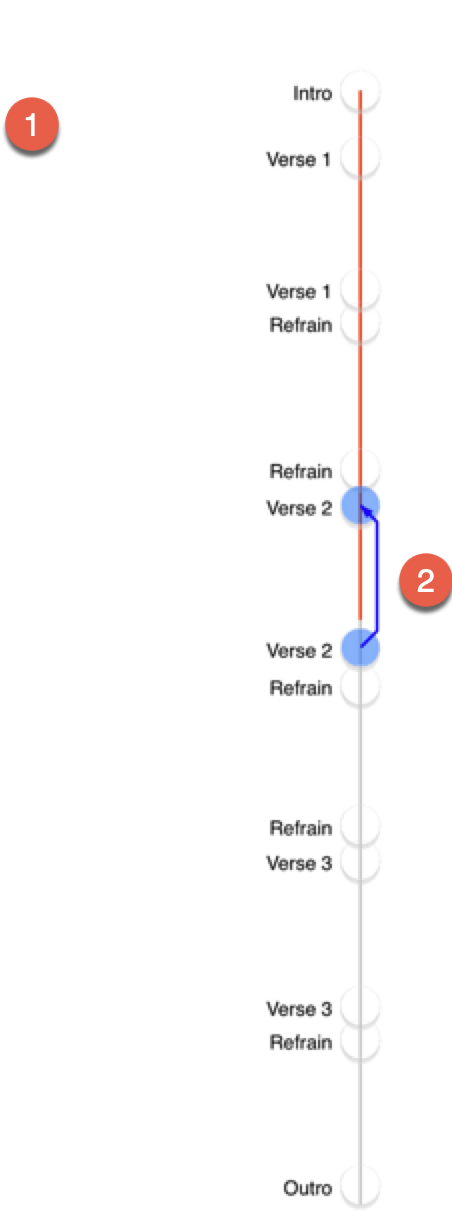 如果激活了两个标记,其中至少有一个在将来,SongBook+ 会用箭头显示计划的跳转。 当第二个标记被达到时,系统会执行该跳转,只要它仍然处于激活状态。