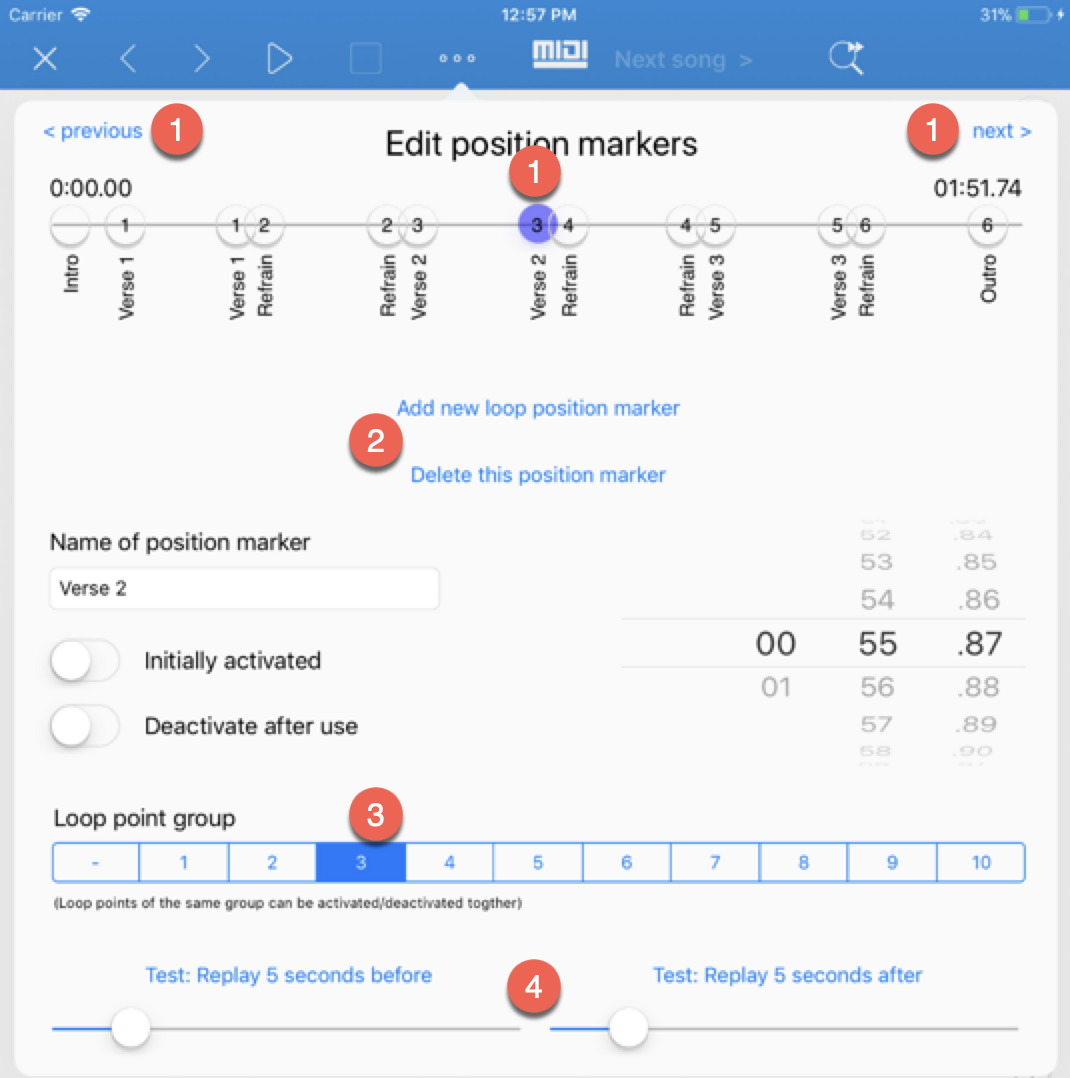 当伴奏回放暂停时,位置标记也会出现。通过点击一个标记,可以将当前位置设置到该位置。